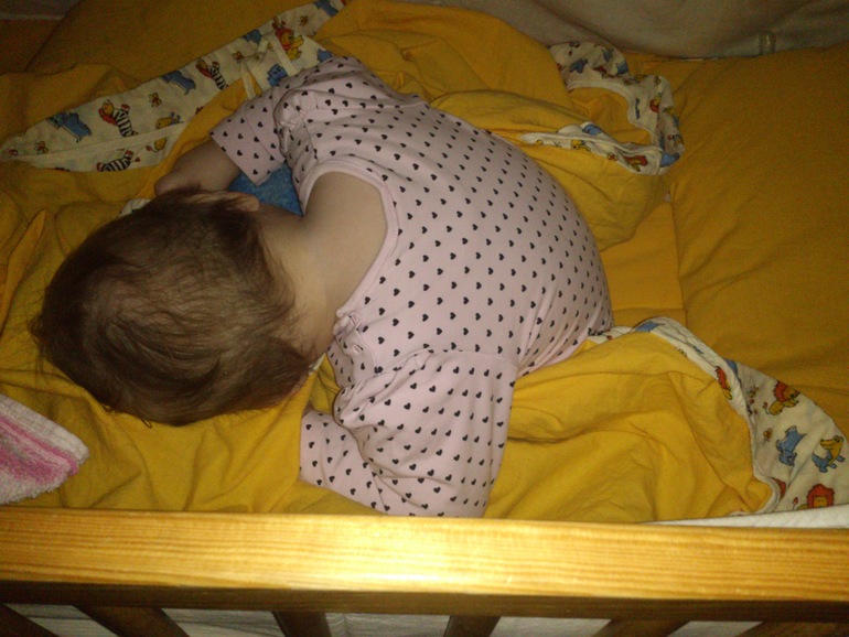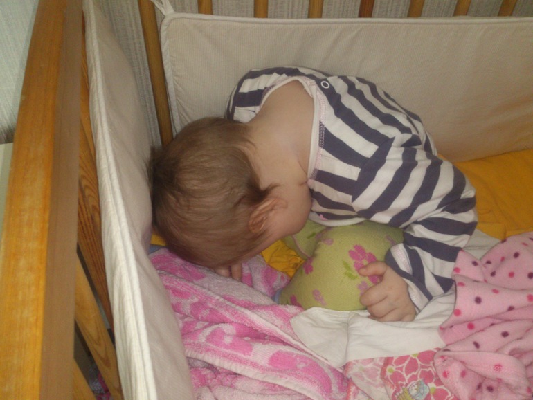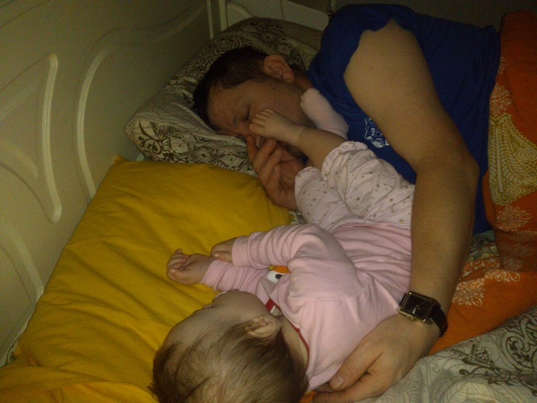 Ну, и об Ульяше. 11,1 кг и 76 см. Зубов 6 и ещё 2 вот-вот. Стоит и ходит у опоры, ползает со скоростью света. Папе никак не хватает времени поставить заграждение на лестницу. Поэтому не спускаем с глаз, когда не спит. А спим мы по-разному)) Бывает, вот так: