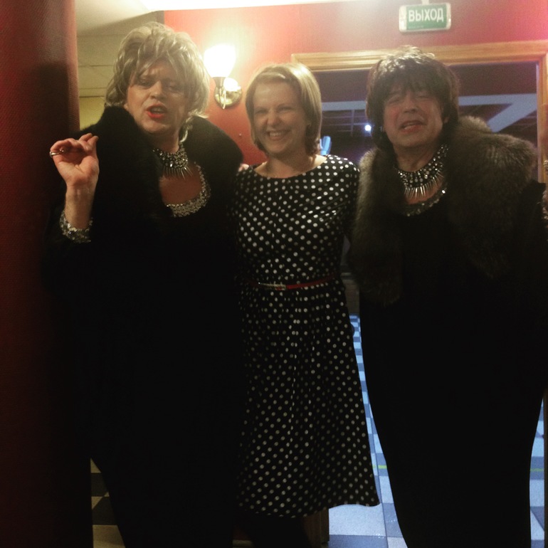 Основатель театра, режиссер, заслуженный артист Валерий Белякович и актёр театра и кино, художественный руководитель театра на Юго-Западной Олег Леушин! Они мне пели с Днём рождения!!! Захожу я такая в театр и на пороге они, встречают))) Я в обмороке, конечно. Они откачали-успокоили, спели и попросили занять места, согласно купленым билетикам;))