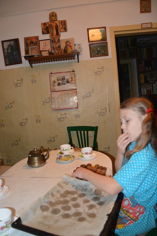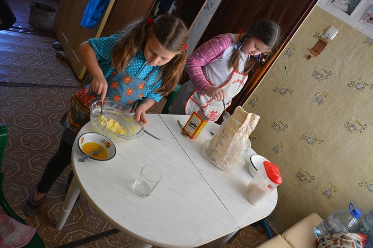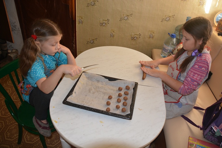 Старшая давала младшей мастер-класс по печенькам (позавчера старшая делала это сама впервые, с моей помощью, по учебнику технологии и по рецепту из него же, результат всем понравился).