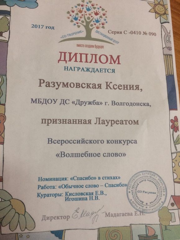 Детки многодетных семейДевочки, сегодня моей средней дочке-имениннице вручили диплом лауреата Всероссийского конкурса "Волшебное слово".