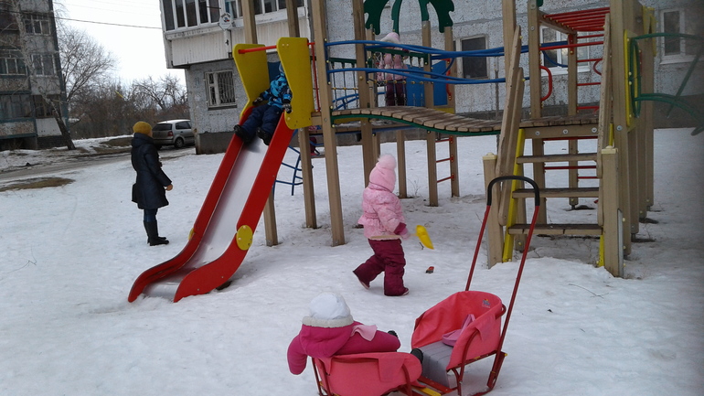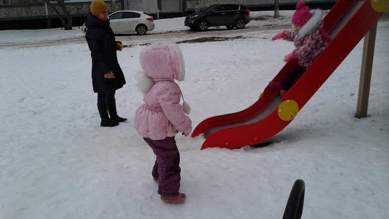 Еще я одна ходила гулять с погодками. Зимой я одна не ходила, а здесь все очень удобно! У нас отличный двор! Много детей. Лиза общается со всеми детьми, сама подходит, начинает играть!