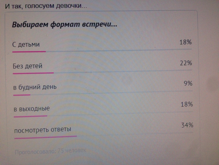 И так, по итогам голосования большинство проголосовало за встречу без детей и в выходной день!!