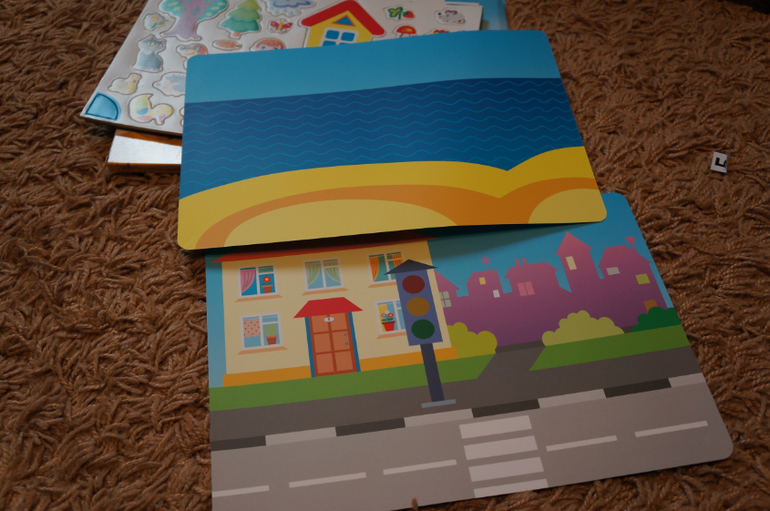 Набор упакован в коробку-чемоданчик с ручкой. Внутри много магнитов. 4 фона и магнитная доска.