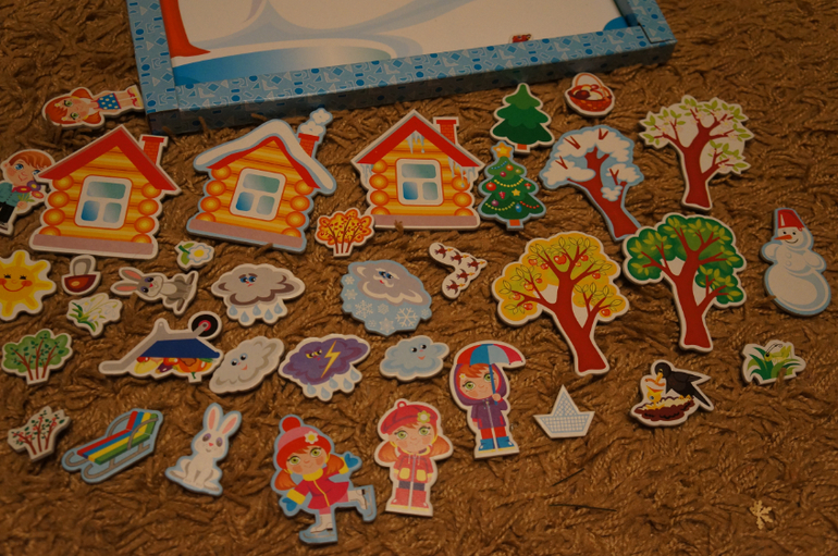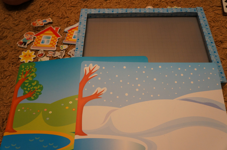 Много магнитов. Есть 4 фона. Я взяла доп. набор, потому что набор с доской нам подарят на НГ.