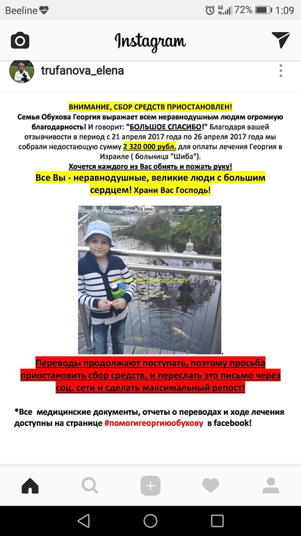 Именно по этой причине , я прекрасно понимаю родителей этого ребёнка ( почему они лечатся там, а не тут) и очень надеюсь , что собирается нужная сумма и малышу смогут помочь.