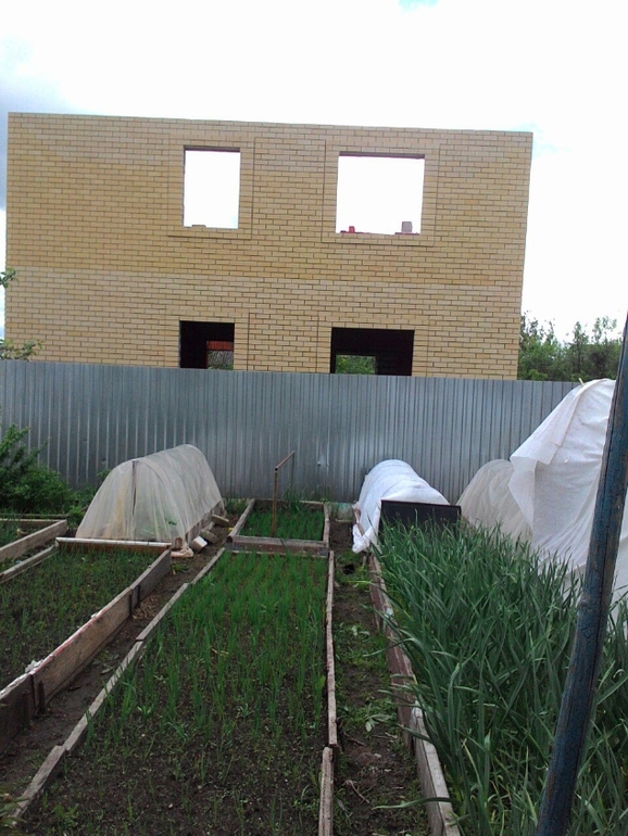 А это строится новый дом, будут жить новые соседи и я просила деда не убирать забор до того, пока не возведут дом. Только меня смущала неизвестность, все остальные были за демонтаж. Но по мере роста дома желающих поставить сетку - рабицу поубавилось.
