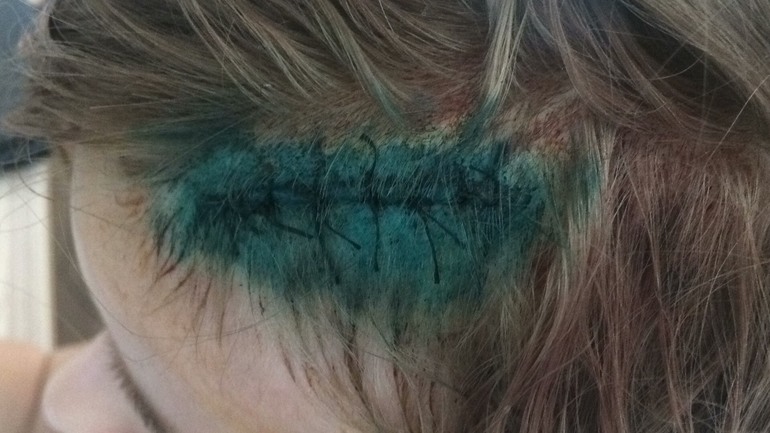 Не переживайте, на нас месяц назад велосипед съехал, сам с лестници спускал, правда мы без скорой, кровь остановила, в травмпункт сама отвезла. Сейчас уже вообще не видно ничего. Было у нас вот так: