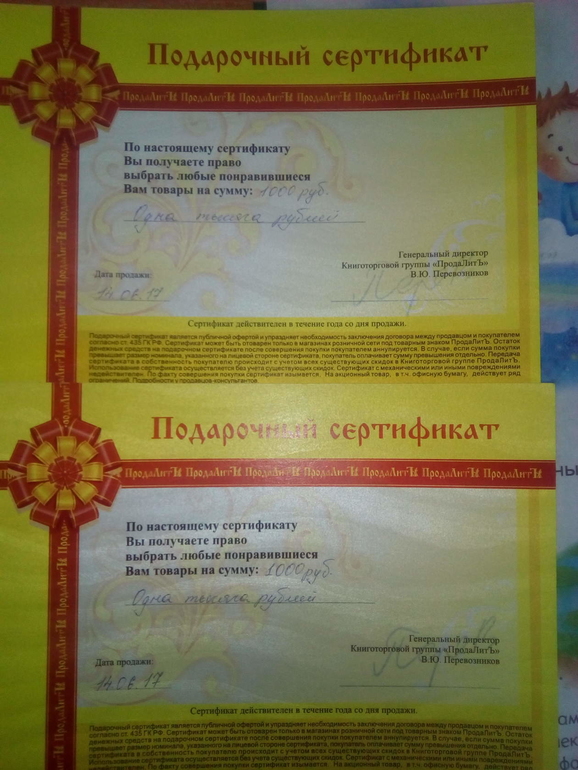 Марфушенька-душенька. Наша Алиса выиграла сертификат на 2000 тысячи.Радости было много,первый раз выиграли.Прошлись по нашим местным магазинам ,хотели купить сертификат ,но в магазинах ничего не подошло.Думали,что же купить полезное и нужное для ребёнка.Остановились на книжном магазине Продалить. Купили 2 сертификата по 1000 рублей.Один сертификат потратили сразу,а второй оставили на следующий раз.