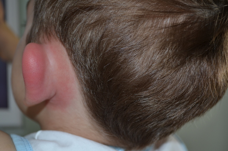 Здоровье детейДевочки, добрый день! прошу совета по оказанию первой помощи у вас)) т к в поликлинике лор принимает вообще 2 раза в неделю, а в платной сегодня лор не принимает, только в понедельник попадем. Если у кого-то было такое, посоветуйте чем лечили. Сегодня утром сын проснулся вот с таким ушком, верхняя часть вся раздута и красная, за ушком тоже все красное, муж говорит, что вчера вечером после прогулки видел маленькую точку на верхней части ушка, укус какого-то насекомого получается. Я утром дала 0,5 таблетки Супрастина. А что еще делать в таком случае не знаю, может помазать чем-то? Всем откликнувшимся СПАСИБО!!!! фото ушка прилагается!