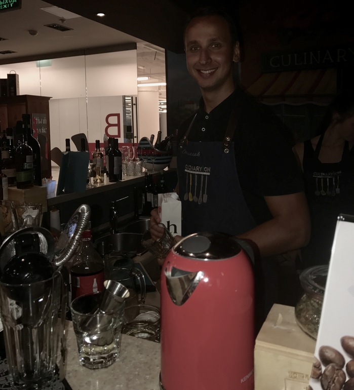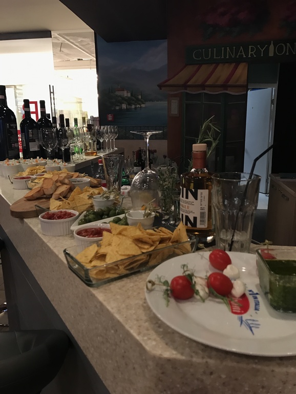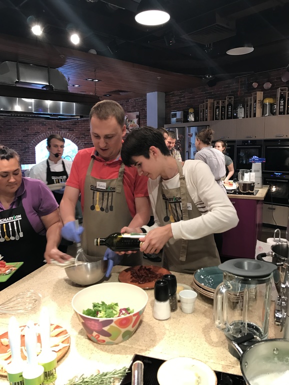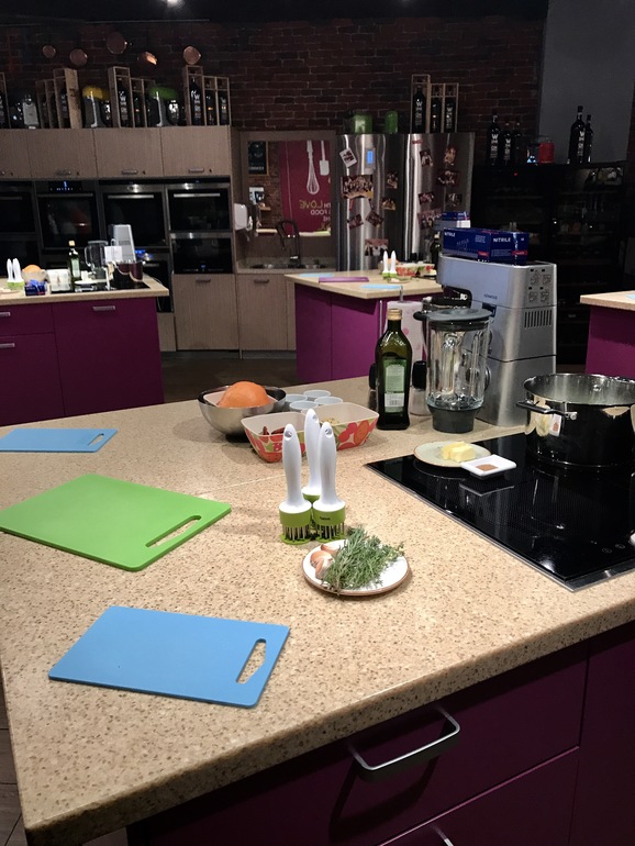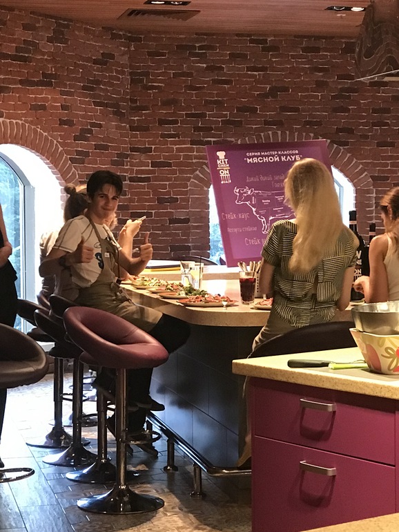 Во первых, это атмосфера. Скорее больше похоже на тусовку любителей готовить нежели на обучение. Музыка, барная стойка где в течение всего занятия бармен угощает разными напитками😉 И закусками