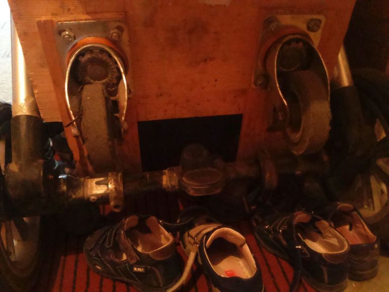 Спинка опускается,помещается лежащий малыш и в ногах отлично помещается еще один ребенок.Мы потом и сидя детей так возили,друг за дружкой.Коляска очень крепкая,устойчивая,развалилась когда мы уже больших детей в ней на речку возили в гору по камням.