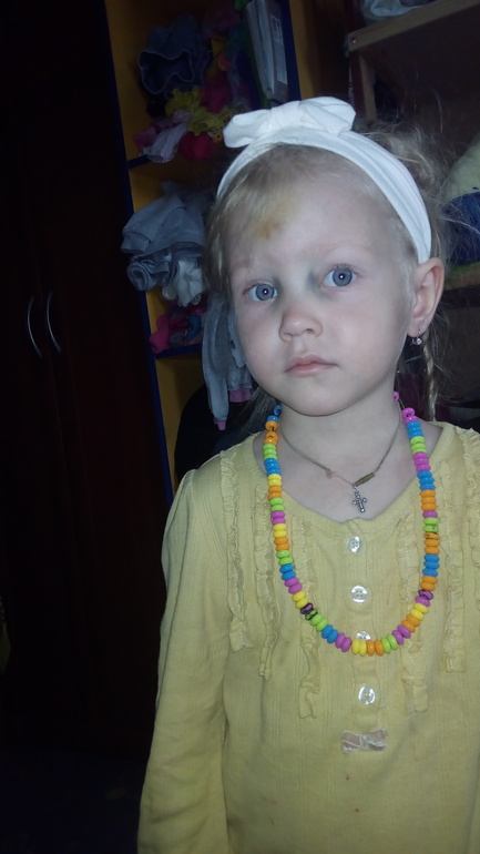 Пока садик был закрыт на ремонт,отправили мы нашу младшую дочу в деревню к бабушке. Все было хорошо,но на этой неделе Лиля качалась на качеле. Качели приделаны в дверном приёме из страховочного ремня широкого. И дети любят закручиваться,а потом раскручиваться...и Лиля не исключение. Закрутилась! А когда раскручивалась ударилась лбом об косяк!!! Немного поплакала,со слов моей мамы,а потом уснула.Мне сразу не позвонили. Ничего её больше не беспокоило,не болело. Холодное сразу не догадались приложить.( Присылали фото. На лбу шишка и синяк. А вчера синяк пополз на глаза! Сегодня её привезли.Вот фото.