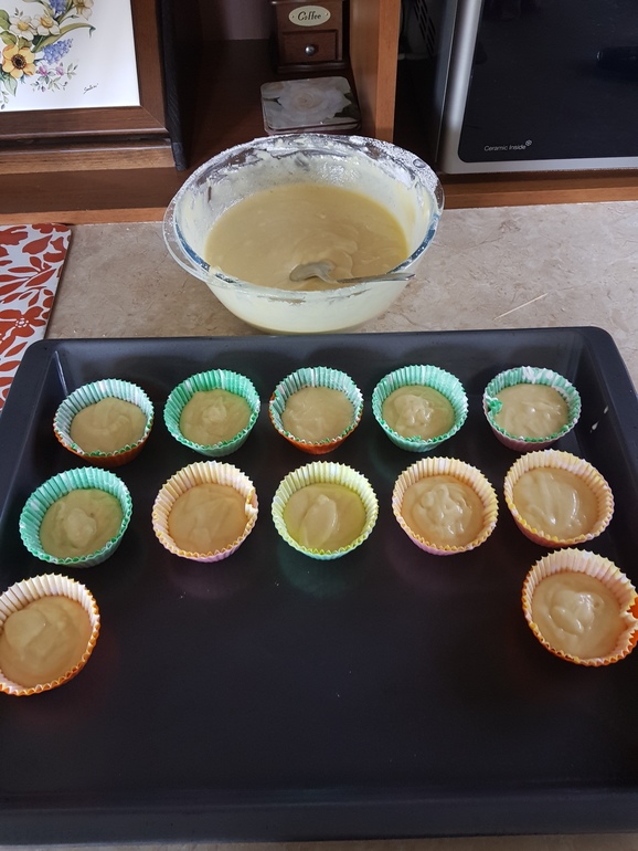 - Смешиваним масло с сахаром, потом добавляем яйца, молоко, далее муку с содой, солью и ванил. Формочки залить чуть больше половины.