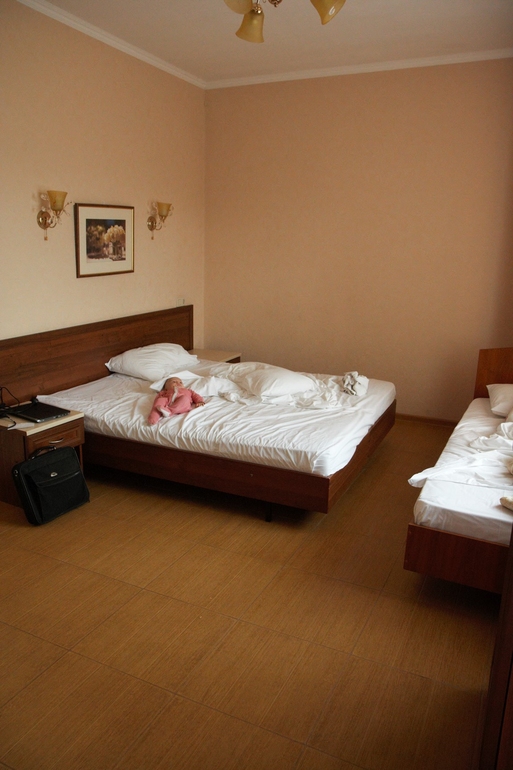 У нас двухкомнатный семейный и почему-то шестиместный (чё-то я намудрила с бронью) номер. Не теряем времени даром, идём к морю.