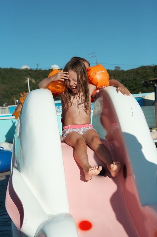 Самая милая горка оранжево-белая, на ней я каталась больше всего, очень приятная и не страшная. На горках можно кататься или на надувных плюшках, или на ковриках. И того, и другого в достаточном количестве.