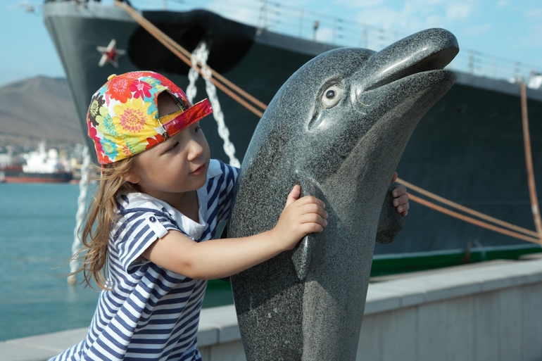 Ляну с трудом увели оттуда через несколько часов. Уходя, она долго прощалась с "щипательными" рыбками-мальками у крейсера "Михаил Кутузов". Нет, вы всё правильно увидели: на фото не рыбка, а дельфин. А рыбки - они в воде.