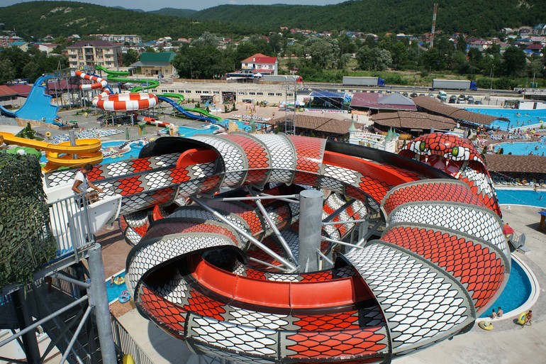 Эти фото с сайта аквапарка, мне самой не удалось захватить эту горку целиком, но она очень высокая, наверное, с пятиэтажный дом. После кружения в трубе резко падаешь вниз, а потом взмываешь вверх в пасть кобре.