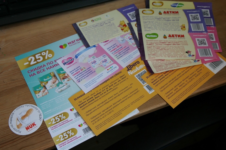 Купоны на подгузники+вещи для малыша 3 мес+молокоотсос