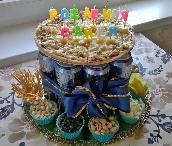Похожий подарок получил мой муж на др, от друзей. Только вместо пиццы, был жерих .