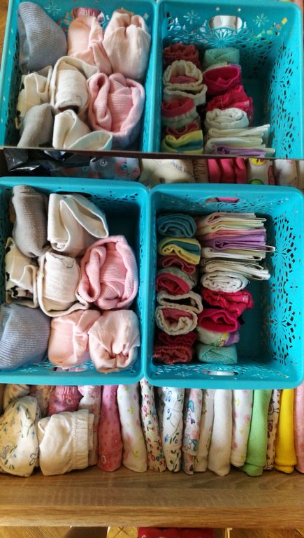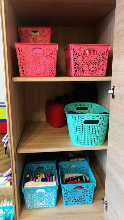 Я фанат комодов, на полках шкафа у меня что то все перемешивается, а так в одном ящике носки, в другом штаны и т.д. У нас небольшие пластиковые+у дочки небольшой угловой для школьных вещей. Верхняя одежда в общем шкафу.