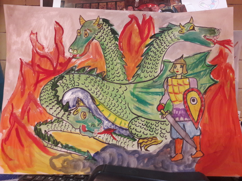 Работу готовил Вася вместе с преподавателем. Я предложила Горыныча, богатырь, на мой взгляд, лишний вообще.