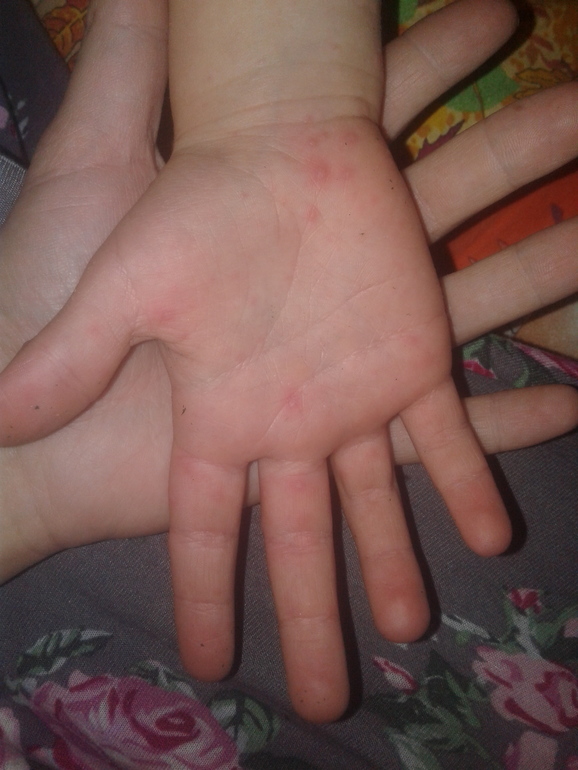 Здоровье детейДобрый день. Подскажите на что похоже. Высыпание у дочки 4 лет , где-то просто красное, где-то с гнойничками. На руках в основном ладони и пальчики, ногах попа, колени , ступни и пальчики, а также на языке и на горле по паре гнойничков.