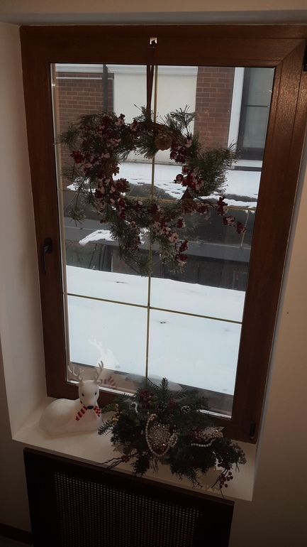 Окна в лестничном пролете композии самодел. Из товаров икеа. Венки покупные. Медведи и олени ашан.