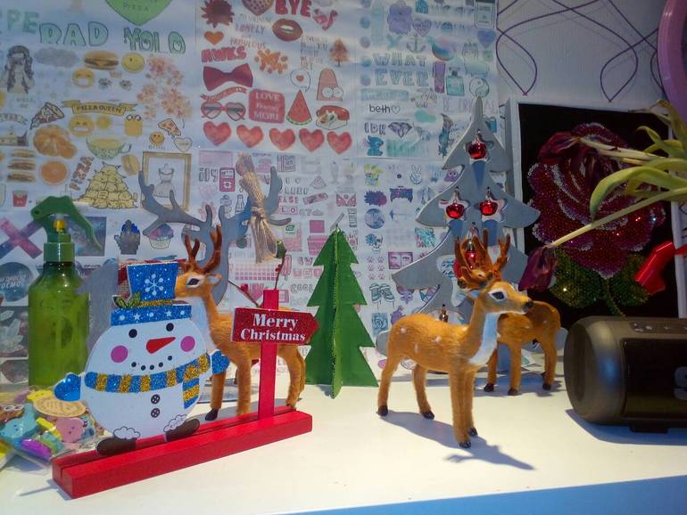 Стандартно. Елка. Снежинки или какие нибудь Дед Морозы на стекло. Гирлянда светодиодная на окно.Украшения на стены. Все делаем во второй половине декабря,ибо надоедает