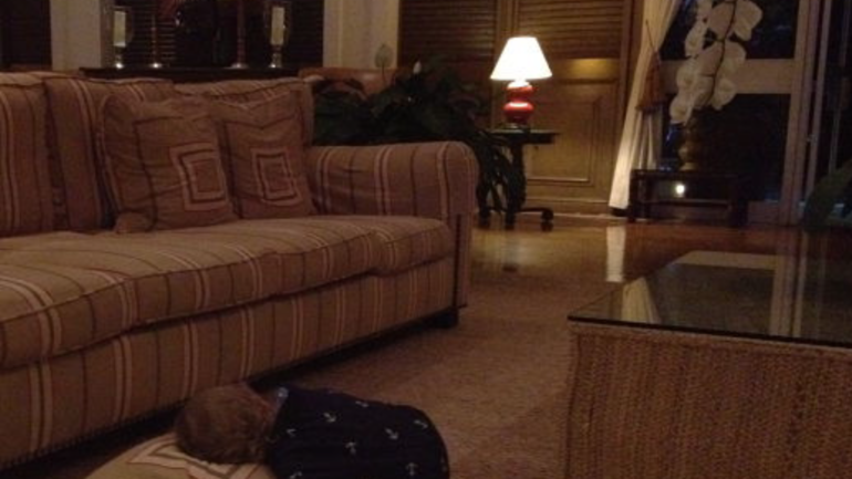 Москва. Даже дома в тёплой шапочке. Гавайскому мальчику холодно.