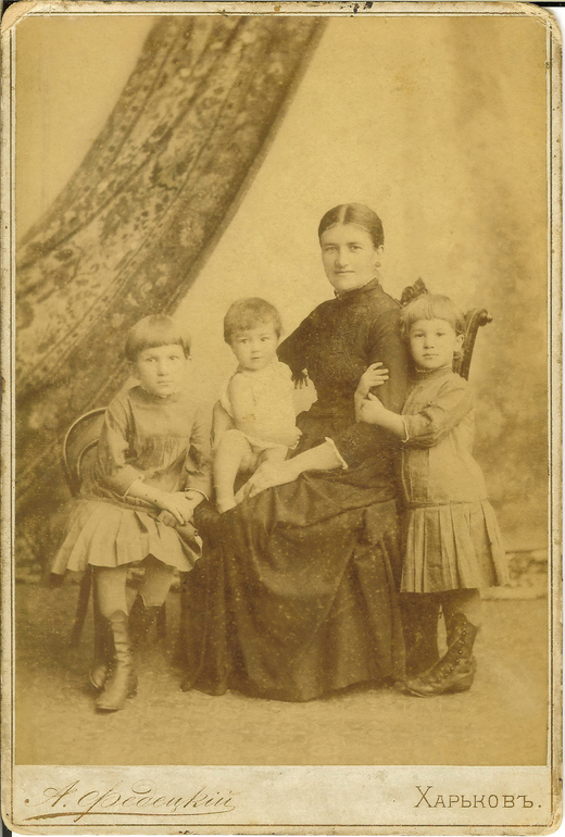 Моя прабабушка (девочка справа на фото) закончила гимназию в 1901 году. Вышла замуж за врача, одессита. Несколько лет жила в Одессе. Папа её мужа тоже был врачом, очень хорошим гинекологом. Каким врачом был муж, мы не знаем. Детей у них не было. Потом прабабушка вернулась в Харьков и устроилась работать на телеграф. Где и познакомилась со своим вторым мужем, моим прадедом. Он был начальником Харьковского телеграфа. В 1915 году родилась моя бабушка. На момент рождения дочки прабабушка ещё была замужем за первым мужем. Поэтому бабушку записали под фамилией первого мужа- Слюсаренко. И только через пару лет, когда прабабушка развелась с первым мужем и расписалась со вторым, бабушка получила, наконец, фамилию своего отца.