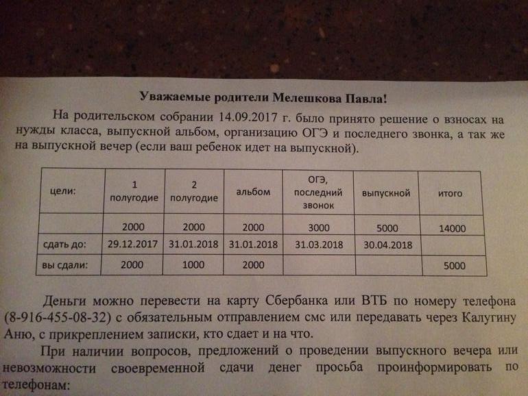 Москва, выпускной в 9 классе. Завтра передам в родительский комитет 5000 рублей.