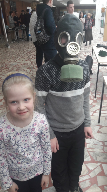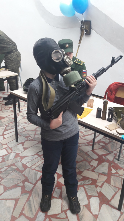 Зависли на стенде военной кафедры. Леха-пацифист даже примерил противогаз. Разглядывали ампулы с маркерами отравляющих боевых газов (новичка, правда, не было))), Вася собирал-разбирал автомат)