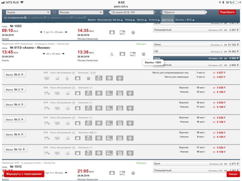 Как видите плацкартный 4800, купе меньше 5100. Это 012/011, самый быстрый. Стоимость четырёх мест (одно 50%, естественно нижнее) около 15 в итоге, без применения баллов РЖД.