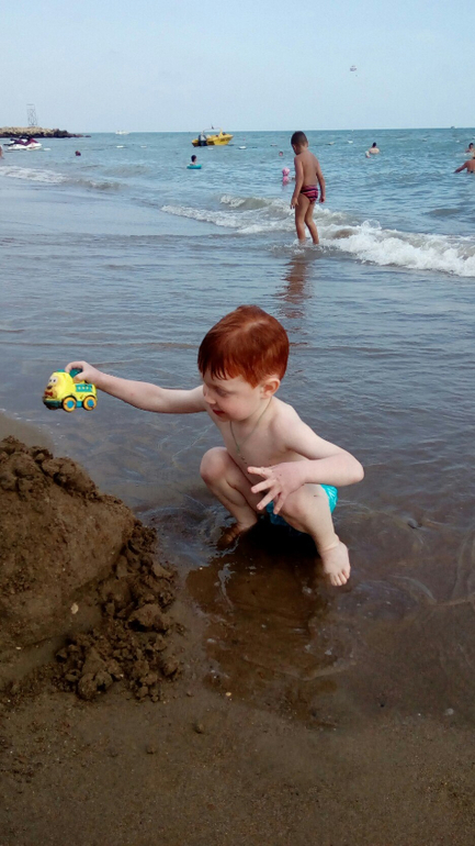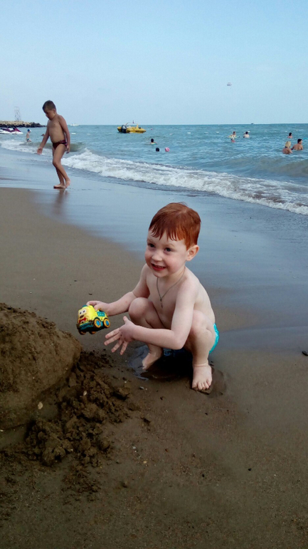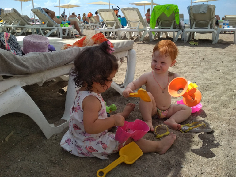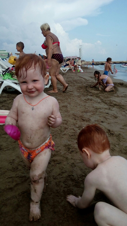 На лежаках,коненчо,тоже не лежали,купались по очереди с мужем в море:один присматривает за 2 деятелями песочных дел на берегу, а второй плавает.