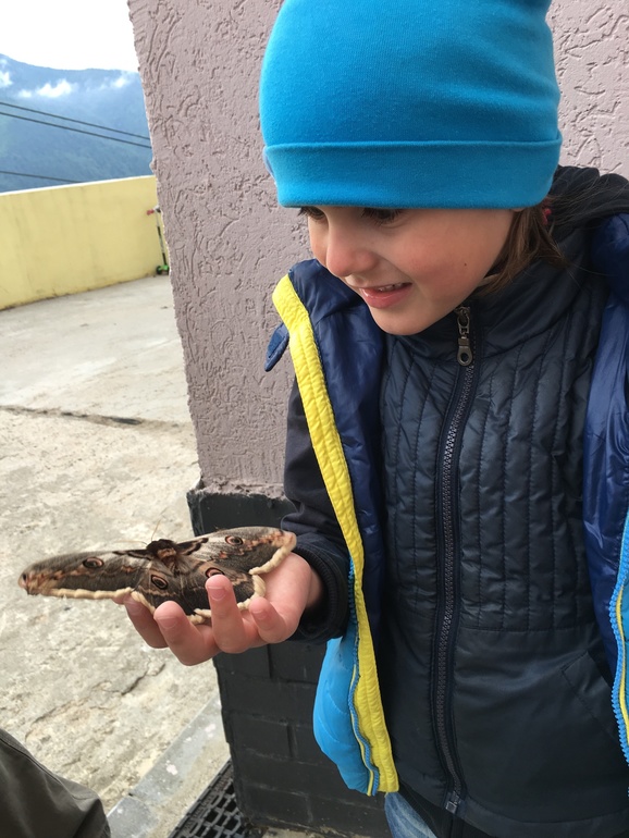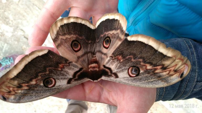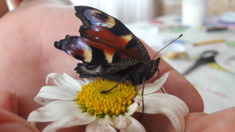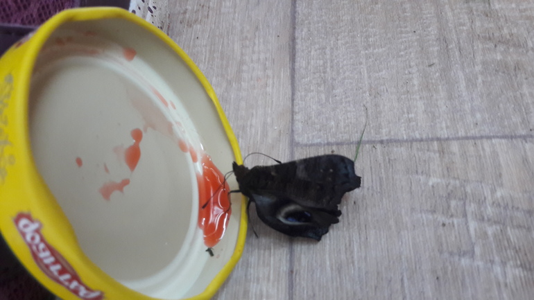 Я все еще сомневалась, что из них реально может вывестись бабочка. И вот через неделю одна из куколок почернела (изначально они были светло-зеленые), я подумала, что она тогось, померла, но утром меня разбудил Вася восторженным воплем: Бабочка! Вывелась бабочка! И правда, на банке со сморщенными крыльями сидел новорожденный павлиний глаз, люмимая бабочка моего детства. Даже я, взрослая тетя, восприняла это как настоящее чудо!) Бабочку кормили сахарным сиропом, так удивительно было смотреть, как она пьет его своим хоботком. Потом ее крылышки расправились, и она улетела. Вслед за первой появились еще две из соседних банок)))