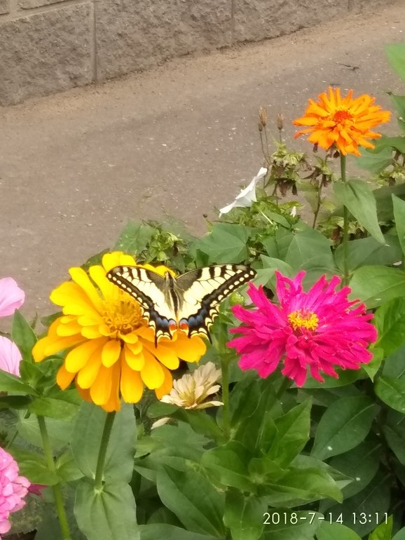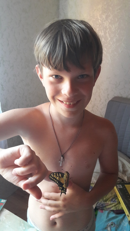 Но кульминацией нашей бабочковой эпопеи стала встреча с махаоном. Года три назад мы увидели на огороде огромную яркую черно-зеленую гусеницу, пока я ходила звать детей на нее посмотреть, мама решила, что это какой-то страшный вредитель и ее прибила. Я потом в интернете опознала гусеницу махаона. Дети до сих пор не могут забыть бабушке то ужасное злодейство и усердно ищут эту редкость у нас. Логично, раз была одна, значит, могут быть и другие! И вот на днях, я отъехала с Гришей в магазин, возвращаюсь - бегут мне на встречу с диким криком: Вася поймал махаона! Иду в дом, и правда, махаон! Они ему обустроили жилище в большой кастрюле, устлали ее травой и цветами. Он сам как цветок, можно разглядывать бесконечно, создал же Господь такую красоту! Я фоткала на телефон, он конечно, всей прелести не передает. Удивительно, махаон садился, если ему подставляли руку, сидел, не делая попыток улететь, расправлял крылья, давая нам возможность любоваться. Насмотревшись, нафоткавшись, понесли его на улицу, чтобы выпустить, а он не улетает. Уже солнце садилось, возможно из-за этого. Тогда забрали его обратно в дом, побоялись, что кто-нибудь сожрет. На другой день вынесли на утреннее солнышко, и он сразу вспорхнул и полетел, очень надеемся, что он найдет себе пару. Махаоны живут всего три недели, откладывают одиночные яйца на зонтичных растениях, например, не борщевике. В огороде его можно встретить на укропе и петрушке (мои каждый день бегают смотреть).