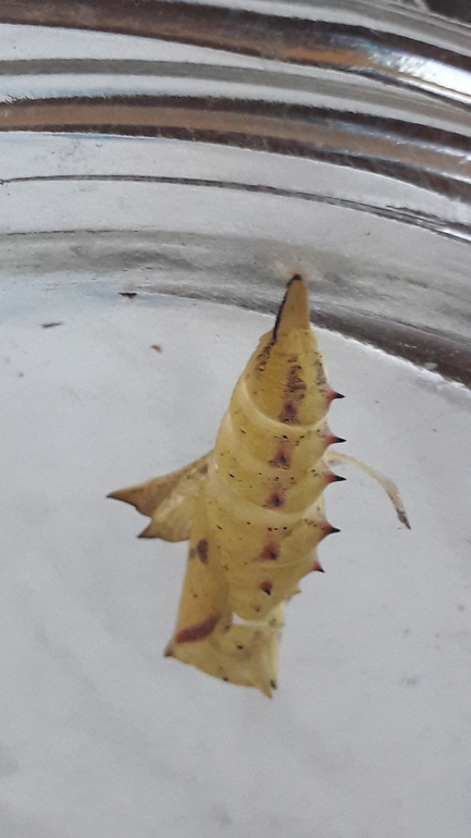 Когда Вася мне принес банку с такой гусеницой и крапивой и сказал, что будет выводить бабочку, я отнеслась к этому очень скептически, но уже в тот же вечер гусеница повисла вниз головой, и вскоре мы увидели настоящую зеленую куколку! Я вообще первый раз в жизни куклку видела. Скоро у нас их стало три! У каждого своя)))