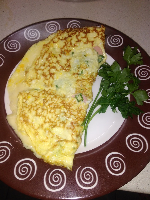 Омлет! Начинка -зелень и сыр. Курочки в холода несут в день всего 3 яичка... Купили им лампу, надеюсь производительность увеличится) и последний свежий урожай петрушки. В огорде оставили только кабачки и тыквы. Всё! Сезон закрыли!