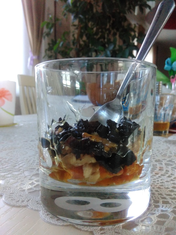 Стакан здоровья)) курага-орехи-чернослив и свежесобранный мёд с местной пасеки..ммммммм... Вкусно....