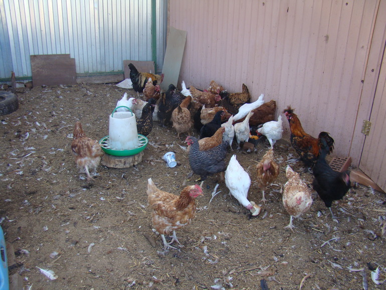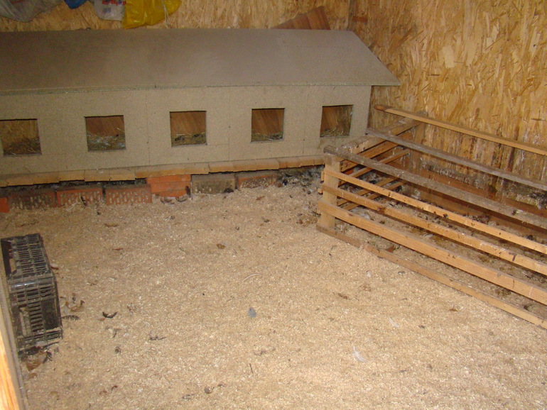 В птичниках опилки, очень мне понравилось, в сравнении с сеном, которое раз в неделю надо было менять.Побелить стены только не успели, ну на следующий год побелим.
