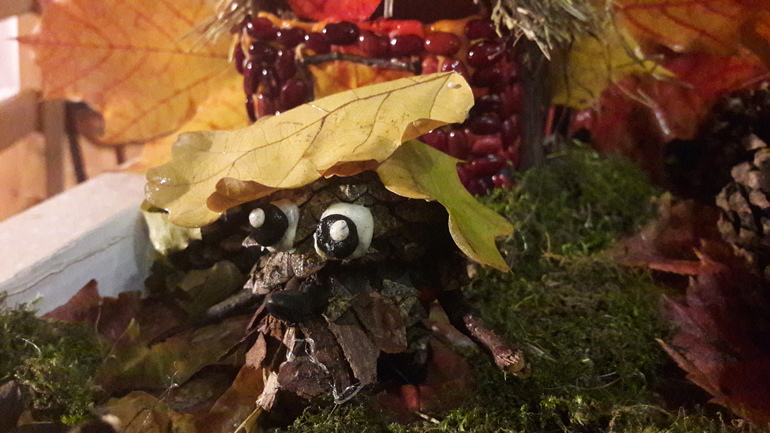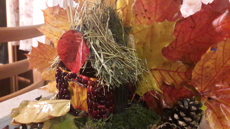 И вот в эту субботу мы отправились на сбор материала. Погодка улет, осень в расцвете, так что получили большое удовольствие). Собирали с Лилей и Гришуткой. Когда я, войдя в раж, азартно отскребала мох под кустами, мимо проходящая женщина с собачкой поинтересовалась, не грибочки ли мы ищем))). Итак, притащили домой большой пакет всяческих осенних даров. Решено было делать осенний домик, и получилась у нас такое лиственно-шишечное буйство). Весьма так жизнерадостно, нам понравилось):