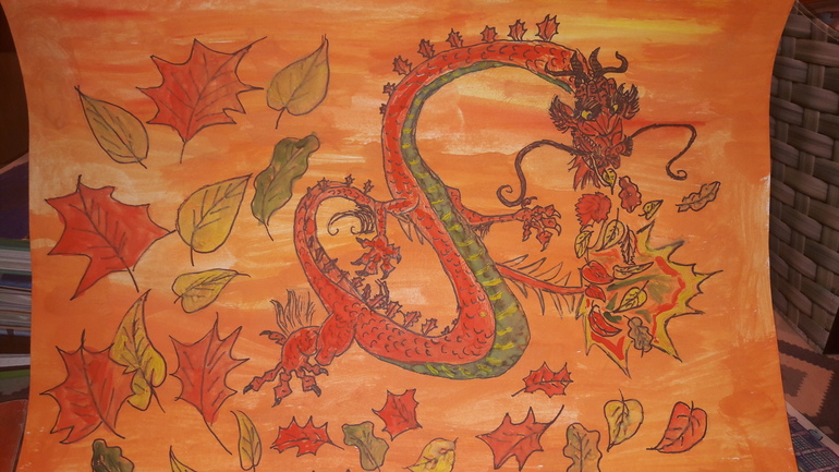 Японский дракон из книжки, которую уже показывала. В описании, кстати, вызывает дождь, а у Васи - выдыхает пламенные листья))). Рисовал в смешанной технике: фломастеры плюс гуашь)