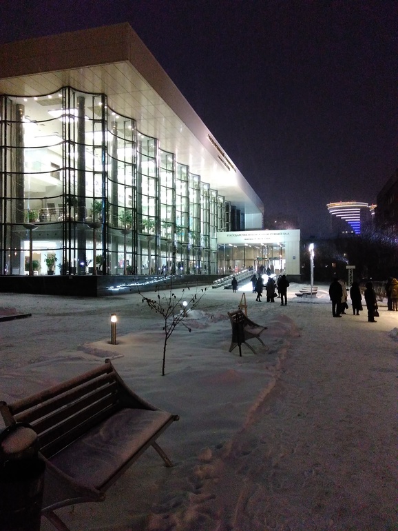 Концертный зал построен 5 лет назад. Светлое, очень хрупкое на вид здание, привлекает внимание своей волшебной торжественностью. Вечером весь город в суете, машины, пробки, люди торопятся скорее домой, скорее к своим семьям, своим важным ежедневным делам, бегут..бегут.., уткнувшись себе под ноги..., гололёд, бегут..бегут... И хотелось остановить время, хотелось просто стоять и смотреть на падающий снег, который сказочно искрится в свете фонарей, хотелось подставить снегу лицо, закрыть глаза и почувствовать как тают снежинки ... Уверена, что в этот момент у меня была по-детски наивная улыбка))) Ни одной тревожной мысли, ни одного контрольного пунктика в моей голове... Только я, муж... и музыка...