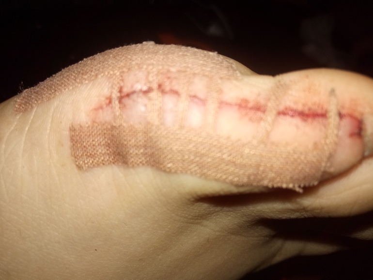2. стягиваем края раны и заклеиваем тонкими полосками лейкопластыря