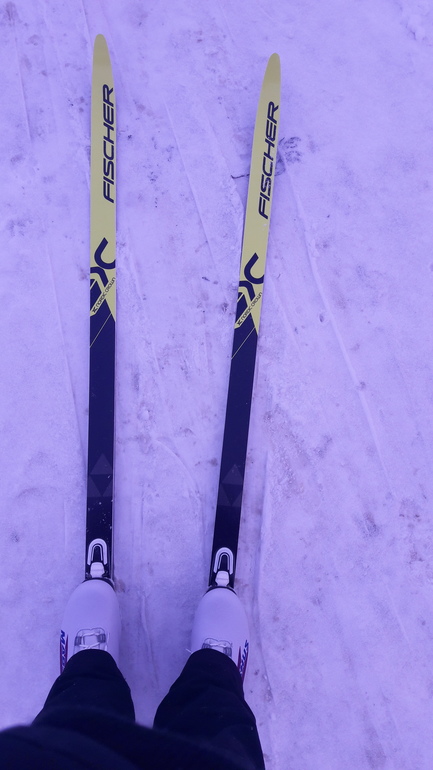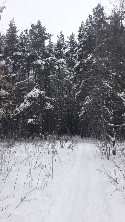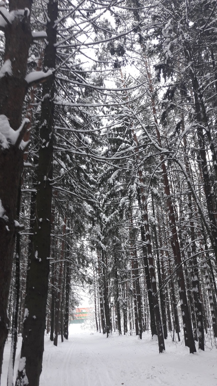 Не знаю, почему фотка получилась фиолетовая). Я поехала товарищи! Прошло 20 лет (около того), когда я делала это в последний раз! Мой восторг не передать словами, это было просто сказочно, волшебно и т.д! Во-первых, лыжи! Они офигенно скользят! Не знаю, может, погода была идеальной (около 8 градусов), я их ничем не мазала. Консультант в спортмастере впарил мне мазь какую-то универсальную (700 рэ). Сказал: при нуле и выше - натирать область крепления, при ниже 10 - верх и низ лыжи. А может, наоборот!))) Не помню я))). Но в общем, по сравнению с моими старыми совеццкими (полупластик), они летят!). Я прям нормальненько так катилась, осторожно, не напрягаясь слишком, понимая, что сердце у меня уже не торт, и с ним надо аккуратно. Ну и сказочная красота кругом), лес зимний, чудесный! Все в снегу, красотища))). Два раза меня на лыжне со свистом обгоняли дедки. По лицу - лет 80, а скорость, легкость, старая закалка. Потом уже на обратной дороге встретила пожилую даму в очень красивом лыжном костюме (устыдилась своего стремного вида, но потом решила, что если честно откатаюсь этот сезон, куплю себе тоже красивую экипировку).Сделала несколько фоток, но они с телефона и близко не передают прелести зимнего пейзажа