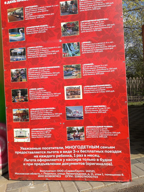 Еще и с 21 мая по 17 сентября... Мы в том году ходили в коломенское, там да, любой вторник и до конца сентября было. А вот у нас в парке (тоже кстати инфа к сведению) в Воронцовском, там небольшой закуток с аттракционами, и можно в любой будний день прийти. Дают из расчета по 3 билета на каждого ребенка в месяц, я так поняла нам можно взять 9 билетов, а кто кататься будет им не важно.