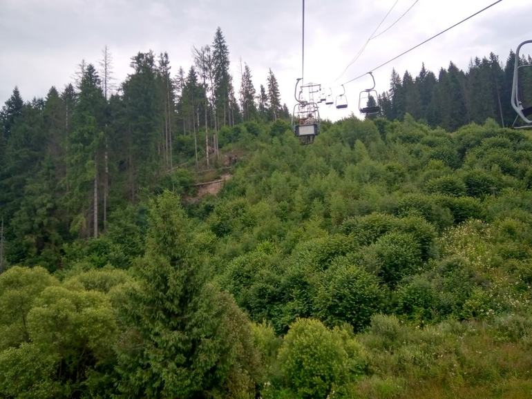 К концу подъема Катя так осмелела, что ногами пыталась верхушки деревьев достать, чем нервировала мужа. Во время самого подъема попали под небольшой дождь, а вот когда поднялись на гору, то от дождя не было даже следов. В этот же день в Славском проходил какой-то велозаезд, все было обставлено очень масштабно и красиво. Правда, было одно большое НО. Старт почему-то находился прямо под подъемником. Люди, при подъеме или при спуске, рисковали задеть голову велосипедиста. Я до сих пор помню перепуганное и слегка шокированное лицо мужичка, который с криком "ОГО" при виде приближающейся меня начал метаться возле линии старта. Ну это на совести организаторов.