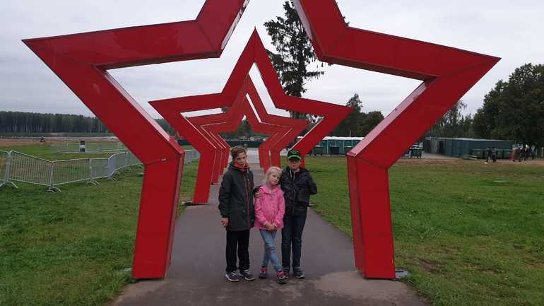 Вполне бодро мы простояли около часа, периодически скандируя: Россия!!! Погода нас кстати пожалела, дождь иногда начинался, но в виде такой пыли водяной больше, а оделись мы к счастью тепло. Правда через час стали подмерзать (слегка) и проголодались (сильно), так что я с Васей и Лилей пошла искать еду, а Лешка с папой стойко остались болеть. Еду мы нашли моментально, там большая площадка с разнообразной кухней, в том числе полевой. Там же навес со столиками и огромный экран. В общем, мы расположились с горячим чаем и хотдогами за столиком и досматривали заезд уже там. Атмосфера прекрасная, очент веселая и радостная, когда все кончилось, встретились со своими и пошли гулять по парку. Это военно-тематический парк Патриот. Очень большая территория, много интересного, но мы конечно уже подустали, поэтому дошли до танков, традиционно полазили по ним