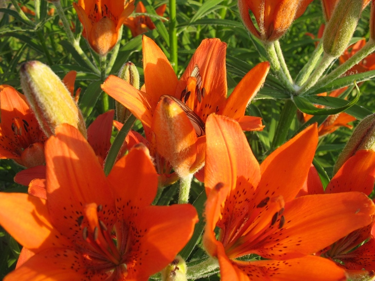Всего за несколько первых тёплых дней тайга зазеленела, распустилась черёмуха, пошли в рост цветы и травы. Кстати, оранжевые лилии - это дикие цветы Эвенкии, саранки по местному.