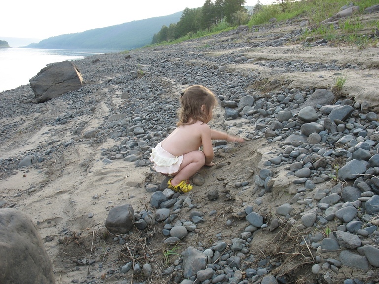 Кнопка в это лето доросла до самостоятельного изучения мира. Уже может отойти от костра и лодки, кидает камешки в воду, играет на песке. В воду сама лезет.